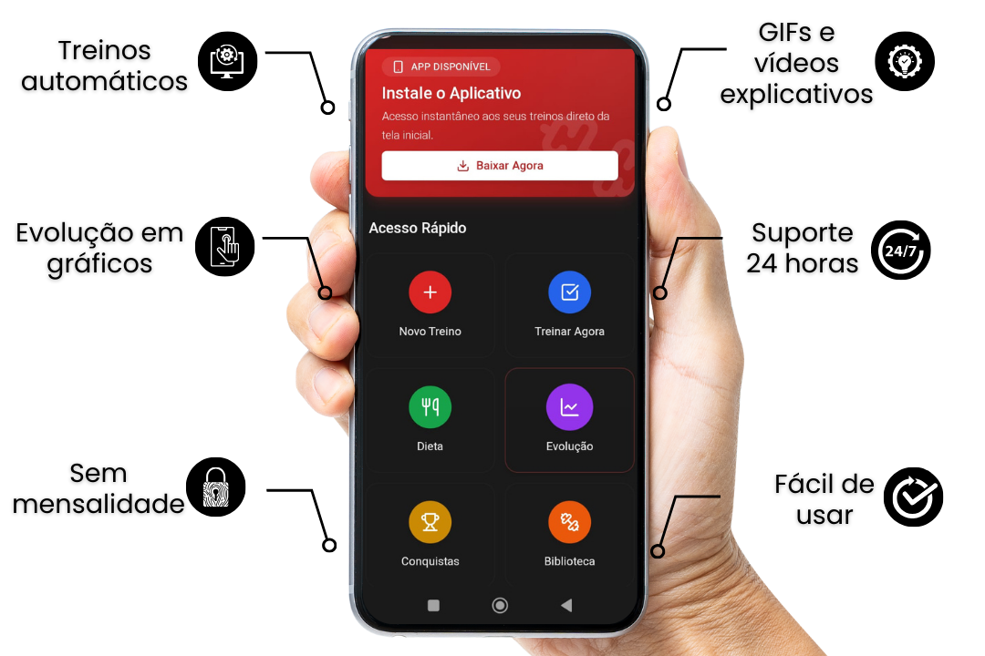 Ao acessar o App Meu Treino, você libera um sistema completo para treinar com método e acompanhar sua evolução direto no celular, incluindo: